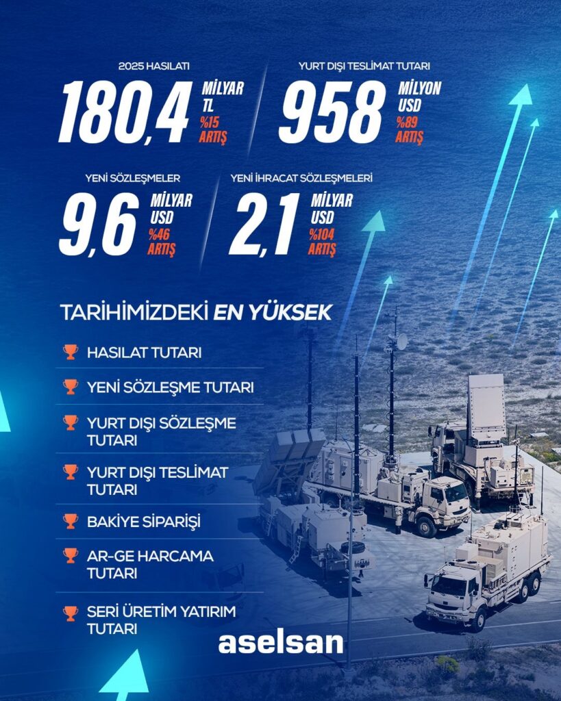 Şirketin 2025 yılı hasılatı, bir önceki yıla göre yüzde 15 artışla 180,4 milyar TL’ye yükseldi. Bakiye sipariş tutarı ise yüzde 46 artışla 20,4 milyar dolara çıktı. Yeni imzalanan sözleşmelerin toplam büyüklüğü de yüzde 46 artarak 9,6 milyar dolara ulaştı.